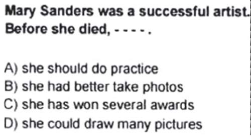 2) Soru kökünün ve şıkların anlamları incelendiğinde D şıkkı dilbilgisi bakımından soru köküyle uyumlu görünse de anlam bakımından pek de tutarlı olmadığı ve bu bakımdan C şıkkının çok daha uygun olduğu görülmektedir. Soru kökünde Mary Sanders adlı kişinin çok başarılı bir sanatçı veya ressam olduğu belirtilmektedir. Cümleyi D şıkkı ile tamamladığımızda bu kişinin ölmeden önce bir çok resim yapabildiğini anlıyoruz. Bir ressam için başarı ölçüsü yaptığı resimlerin niceliğinden çok niteliğiyle alakalıdır. C şıkkında ise , her ne kadar dilbilgisi bakımından uyumsuz görünse de, sanatçının ölmeden önce bir çok ödül aldığı belirtilmektedir. Örneğin bir atletin bir çok müsabakada yarışması tek başına onu başarılı kılmaya yetmez, ancak bu kişinin katıldığı müsabakalarda bir çok madalya aldığını belirtirsek başarılı olma sebebini açıklayan tutarlı bir cümle kurmuş oluruz. Sonuç olarak her iki şıkkın da kendine göre doğru yanları olmasına rağmen ikisi de tam olarak doğru değildir.