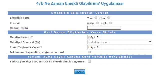 Bağkur için açılan emeklilik hesaplama sayfası 4B ne zaman emekli olabilirim adı ile yayınlanır. Emekli blog sitesinde yer alan emeklilik hesaplama yazısında belirtildiği gibi 4A için de benzer bir uygulama bulunmaktadır.Resimde görüldüğü gibi kişilerin Bağkur emeklilik hesaplama yapabilmesi için formu doldurması gerekir. Formda kişilerin bilgileri istenmektedir. Doğru bir şekilde girilen bilgilerin ardından ise ikinci bir ekran açılır ve bu ekranda kişilerin hizmet eklemesi gerekir. Hizmet eklenmesi ise prim ödemelerini içermektedir. Prim ödemelerini ve ödemelerin ne kadarlık bir süreyi kapsadığı detaylı olarak dönem dönem girilmelidir. Bilgilerin girilmesinin ardından ise kişilerin Bağkur emeklilik hesaplama işlemleri sistem tarafından yapılır. Bağkur emeklilik hesaplama için hizmet girişi yapılan ikinci ekran ise resimdeki gibidir;