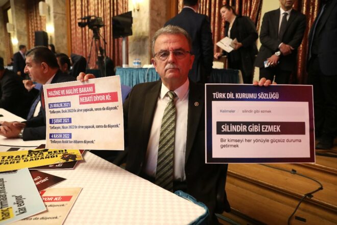 Gürer'in taşıdığı dövizde, Bakan Nebati 28 Aralık'ta diyor ki, 'Enflasyon Ocak 2022'de zirve yapacak sonra düşecek'. 3 Şubat'ta diyor ki, 'Enflasyon Nisan 2022'de zirve yapacak sonra düşecek' 4 Kasım'da diyor ki, 'Enflasyon aralık ayından itibaren düşecek' ifadelerinin yer aldığı görüldü.
