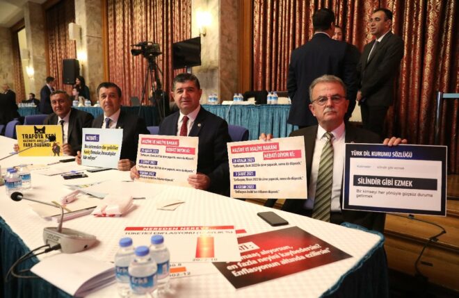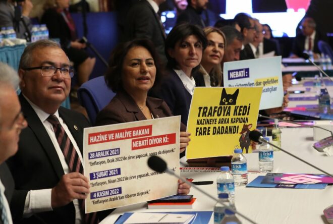 CHP'li vekillerin taşıdığı dövizlerin birinde, 'Trafoya kedi, Hazine'ye arka kapıdan fare dadandı' dendi.