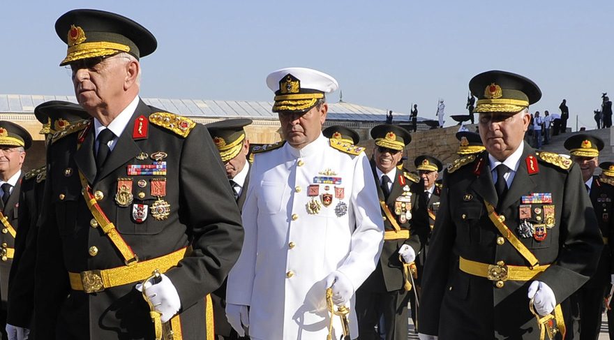 Foto:depophotos – Işık Koşaner (sol baştaki) 2011 YAŞ’ına sayılı günler kala görevinden sürpriz bir şekilde istifa etmiş yerine ise o dönemin Jandarma Genel Komutanı olan Necdet Özel (en sağdaki) ‘bir günlük atama’ formülüyle getirilmişti.ÖZEL'DEN İKİNCİ YANIT