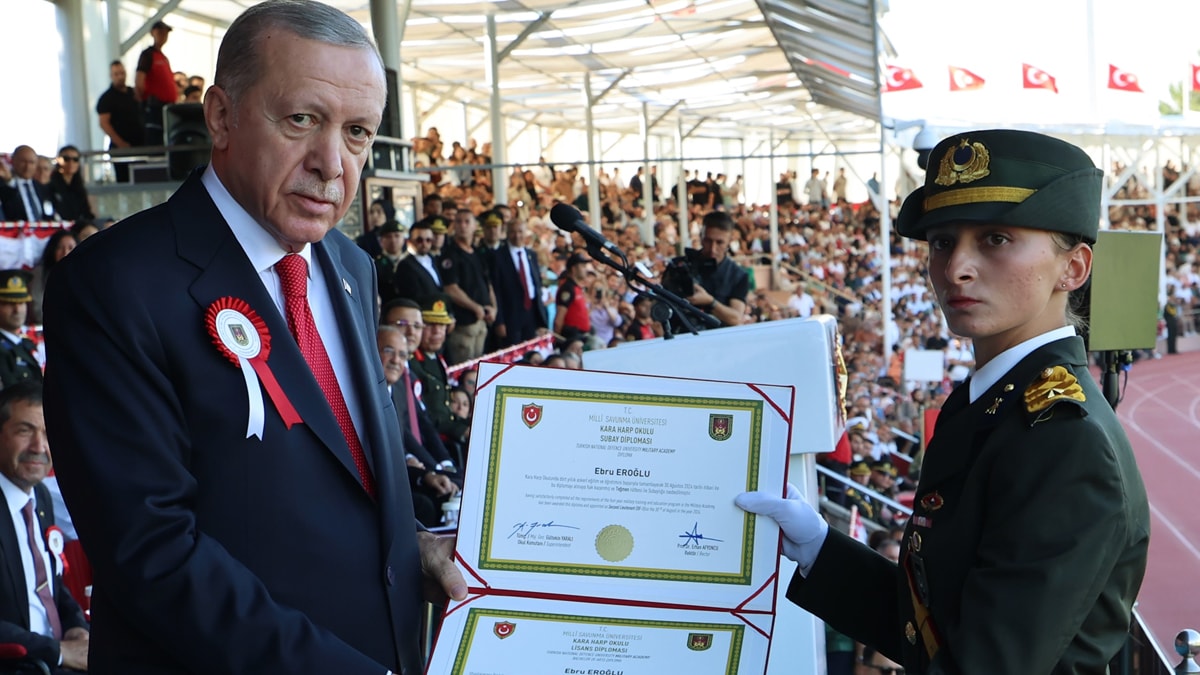 Cumhurbaşkanı ve AKP Genel Başkanı Recep Tayyip Erdoğan, Kara Harp Okulu mezuniyetinin ardından kılıçlı yemin eden ve "Mustafa Kemal'in askerleriyiz" sloganı atan bazı teğmenlerin ihraç talebiyle disipline sevk edilmelerini değerlendirdi. Erdoğan, Kara Harp Okulu birincisi Ebru Teğmen'e diploma vermesine yönelik gelen sorulara da yanıt verdi.