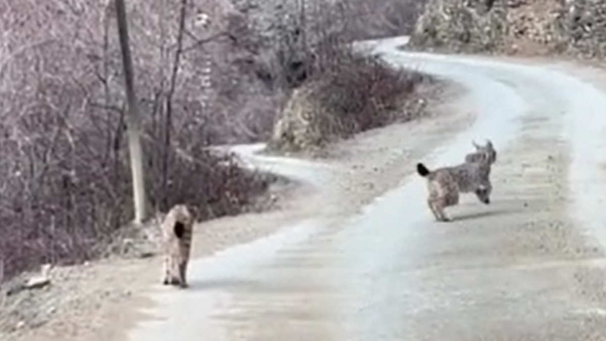 Bir süre yolda yürüyen vaşak daha sonra bölgeden uzaklaştı.