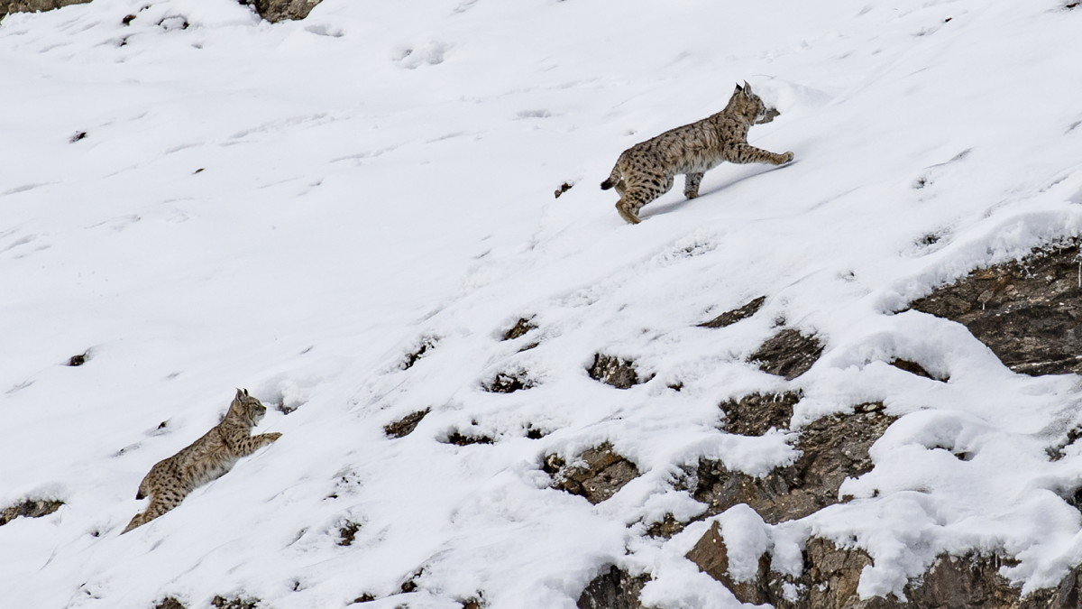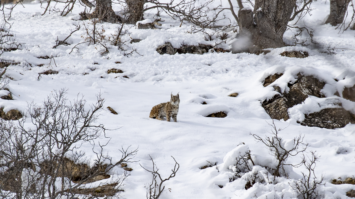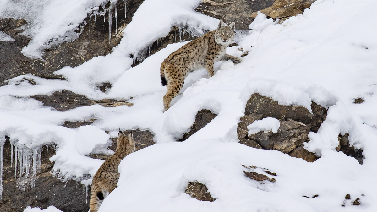 Bölgede nesli tehlike altındaki anne vaşak ile iki yavrusu da milli parkın karla kaplı dağlarında yiyecek ararken görüntülendi.