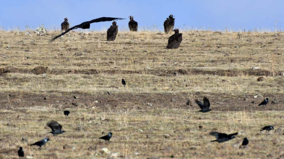 Kars'ın Sarıkamış ilçesinde nesli tükenme riskiyle karşı karşıya olan kara ve kızıl akbabalar görüntülendi.