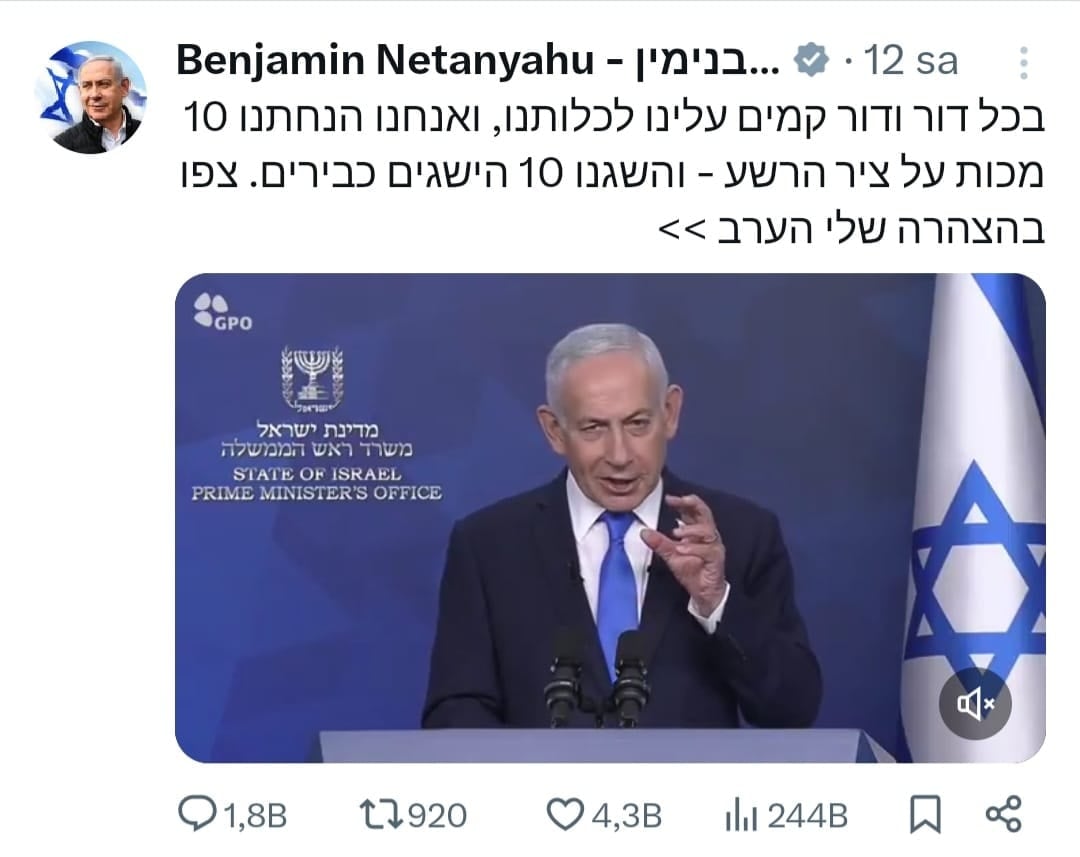 İsrail Başbakanı Binyamin Netanyahu, gazetecilerin bulunmadığı ve kendisine soru sorma fırsatı verilmeyen bir ortamda açıklamalarda bulundu. Netanyahu bu açıklamalarını kendi sosyal medya hesabından paylaştı. Başbakan açıklamasını, "Her nesilde bizi yok etmek için bize karşı ayaklananlar oluyor ve biz de kötülük eksenine 10 darbe indirdik ve 10 büyük başarı elde ettik" ifadelerini kullanarak paylaştı.
