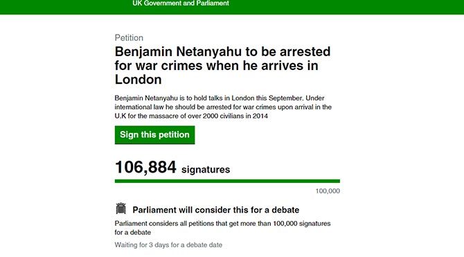 İngiliz hükümeti, yine parlamentonun sayfasında yer alan ve 10 bin kişinin imzasını alan kampanyalara da cevap vermekle yükümlü. Buna göre, İngiliz hükümetinden kampanyaya geçen ay verilen cevapta şu ifadeler kullanılmıştı: "Uluslararası ve Birleşik Krallık yasaları kapsamında, Başbakan Netanyahu gibi, ziyarette bulunan yabancı devletlerin liderlerinin dokunulmazlıkları bulunuyor. Bu kişiler gözaltına alınamaz veya tutuklanamaz. Geçen yıl Gazze'deki saldırıların korkunç bir kayba neden olduğunun farkındayız. Başbakan David Cameron'ın da dediği üzere, bölgede yaşanan şiddetten dolayı hepimiz derinden üzüldük. Gazze'nin yeniden inşası kapsamında yürütülen uluslararası çabalarda İngiltere ön sıralarda bulundu. Ancak Başbakan Cameron, uluslararası insancıl hukukun sınırları kapsamında, İsrail'in kendisini savunmak için alacağı orantılı tedbirler hakkının İngiltere tarafından tanınması konusunda her zaman açıktı."