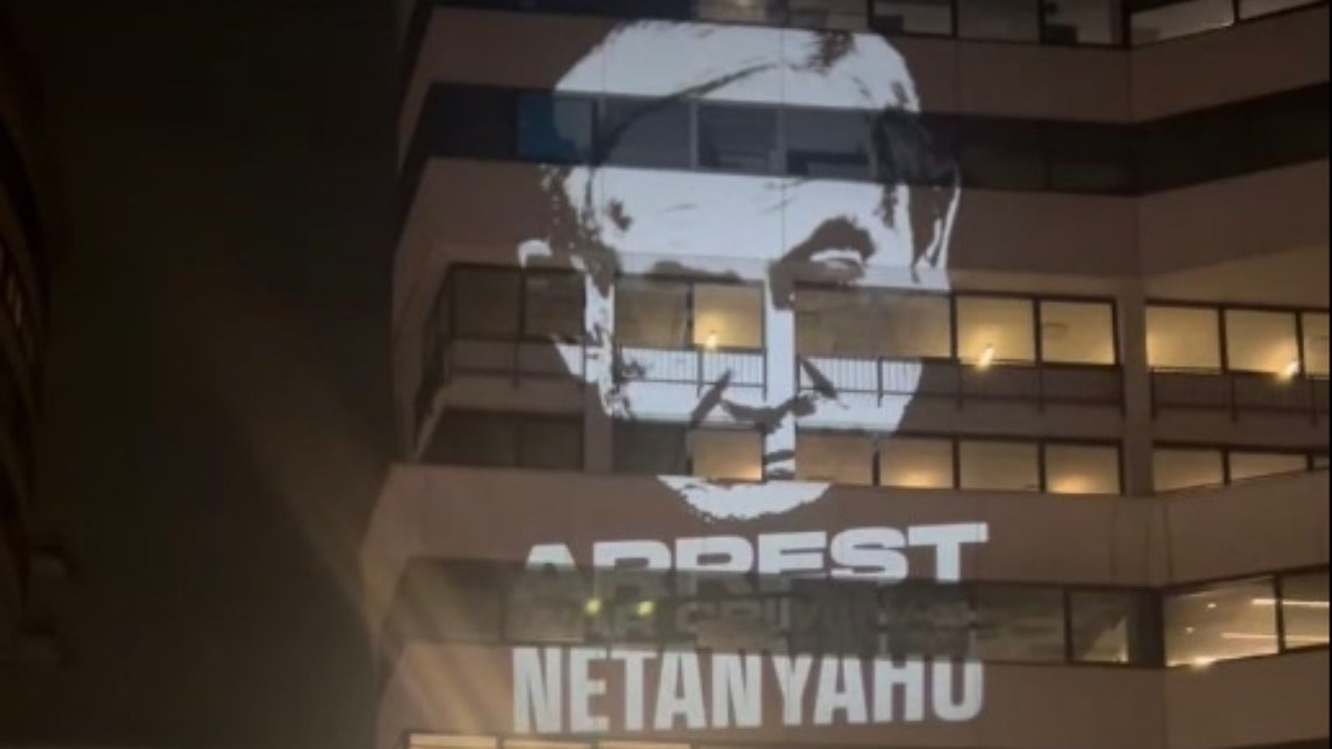 Göstericiler, binaya yansıttıkları lazerle "Aranıyor. Savaş suçlusu Netanyahu'yu tutuklayın." çağrısında bulundu.