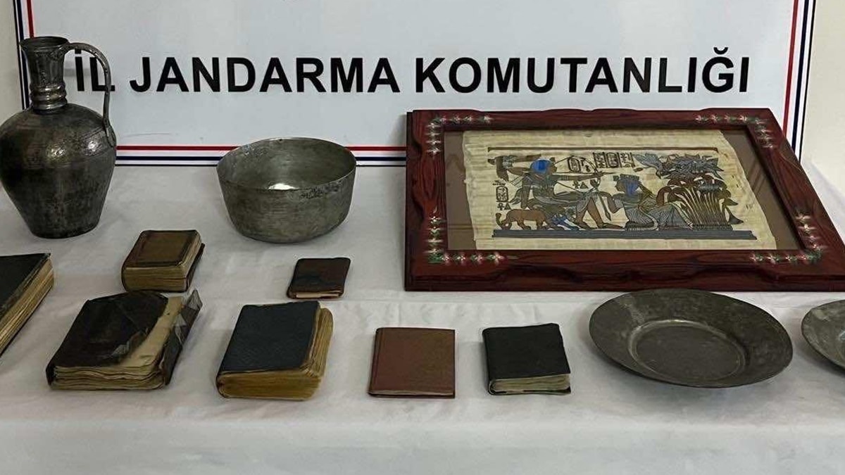 Jandarma ekiplerinin yaptığı aramada, 7 adet el yazması Kur’an-ı Kerim’in yanı sıra tarihi eser niteliği taşıyan 3 bakır tabak, bir sürahi ve bir tablo ele geçirildi. Gözaltına alınan B.C., jandarmadaki işlemlerinin ardından adliyeye sevk edildi.