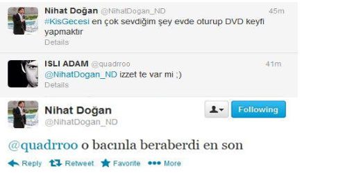 Twitter mesajlarıyla sık sık gündeme gelen Nihat Doğan bu kez ipin ucunu kaçırdı.Sosyal paylaşım sitesi Twitter hesabında 300 bine yakın takipçisiyle sürekli etkileşim içinde olan Nihat Doğan, espri kaldıramadığını takipçilerinden birine attığı cevap ile göstermiş oldu. Nihat Doğan’ın ‘Kış gecesi en çok sevdiğim şey evde oturup DVD keyfi yapmaktır’ mesajına takipçilerinden birinin yazdığı ‘izzet de var mı?’ sorusuna ‘o bacınla beraberdi en son’ cevabı birçok takipçisi tarafından tepkiyle karşılandı.