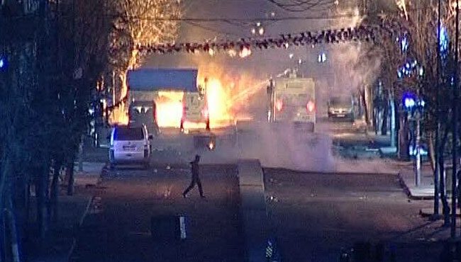 Müdahalenin ardından eylemciler, polise molotof kokteyli ve taşla karşılık verdi. Bazı eylemciler, cadde üzerinde bulunan 2 banka şubesi ile 1 PTT şubesini taşladıktan sonra molotof bombası atarak ateşe verdi. Çıkan yangın, polis ekiplerinin güvenliğinde olay yerine giden itfaiye ekipleri tarafından müdahale edilerek kısa sürede söndürüldü.