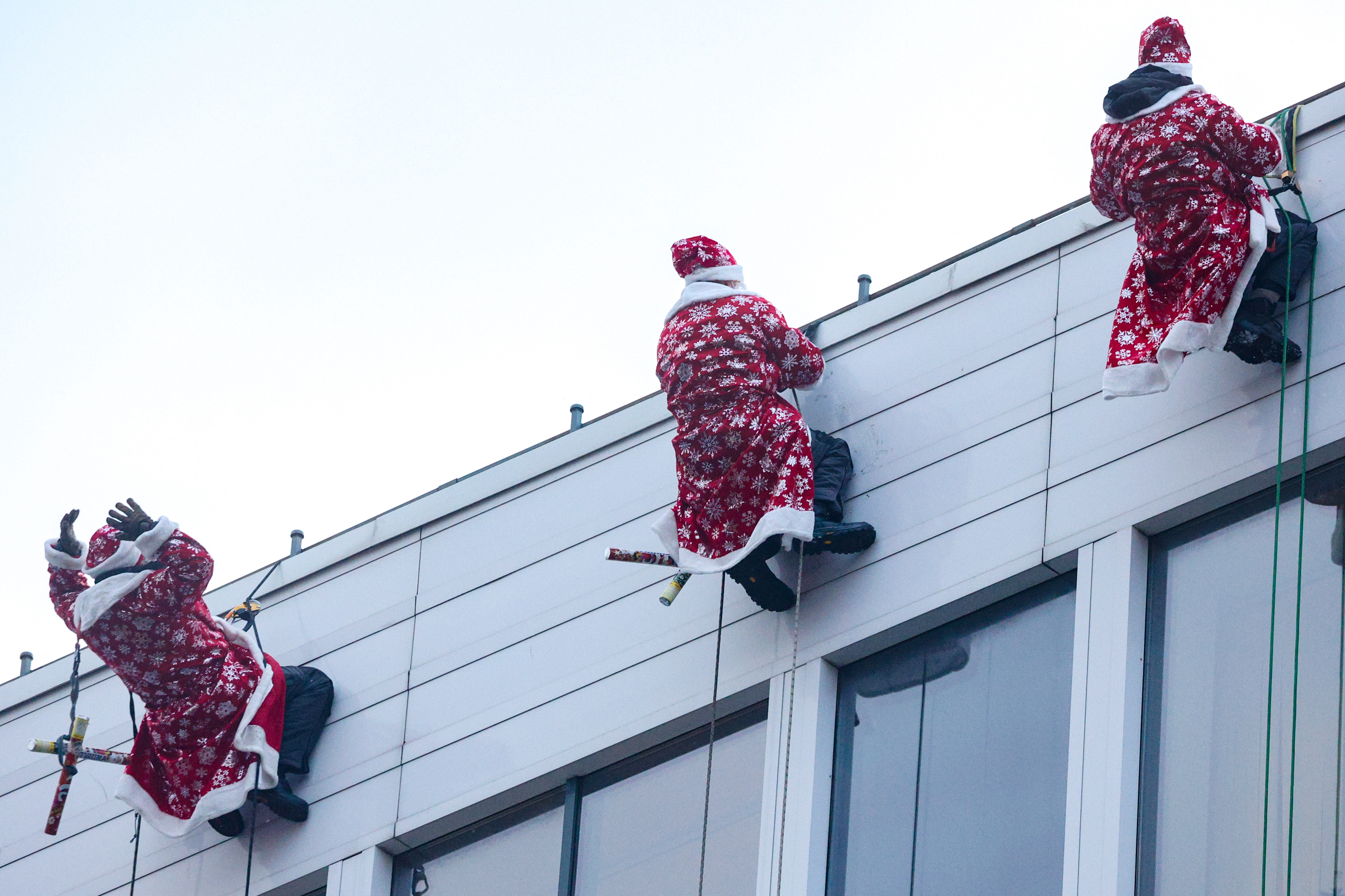 Rusya'nın başkenti Moskova'da onlarca Noel baba, Morozovskaya Çocuk Hastenesi'nin çatılarından iplerle inerek hastanede tedavileri devam eden çocukları sevindirdi.