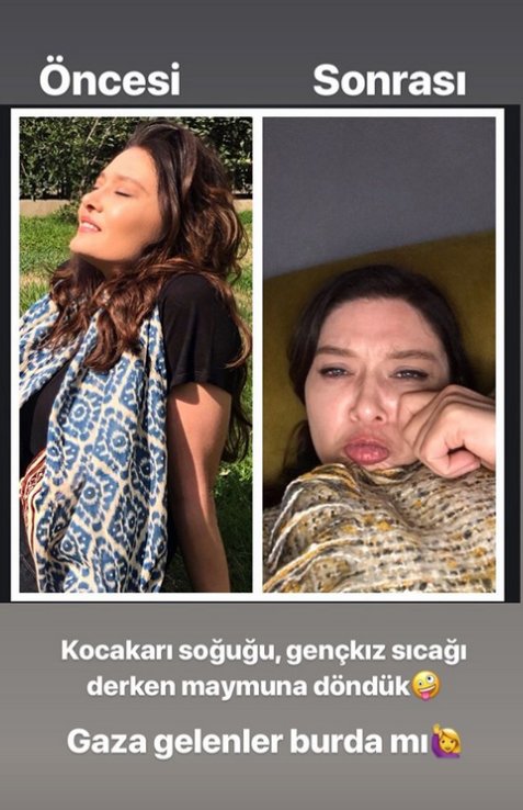 Şimdilerde Gülperi adlı dizide izlediğimiz Nurgül Yeşilçay, sosyal medya hesabını aktif olarak kullanan bir isim... Kimi zaman Cem Özer ile evliliğinden dünyaya gelen oğlu Osman Nejat ile çektiği fotoğrafları ve videoları paylaşan Yeşilçay kimi zaman da kendi fotoğrafları üzerinden keyifli esprilere imza atıyor. Yeşilçay son olarak geride bıraktığımız gün sıcak havanın tadını çıkartırken çekilmiş bir karesinin yanına aniden düşen sıcaklıklar sonrasında çekilmiş bir fotoğrafını ekledi ve ortaya çıkan görüntüyü de hesabından paylaştı. İki kareyi yan yana koyan başarılı oyuncu bunun üzerine; "Kocakarı soğuğu, genç kız sıcağı derken maymuna döndük! Gaza gelenler burada mı?" notunu düştü.