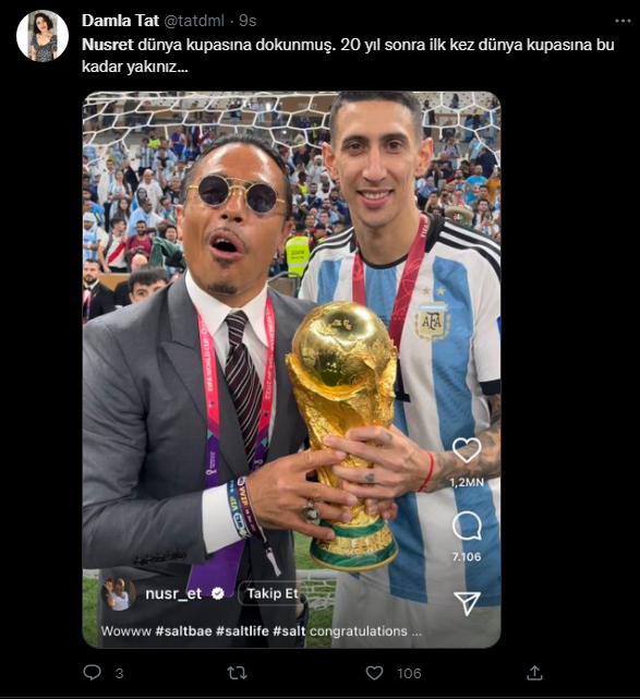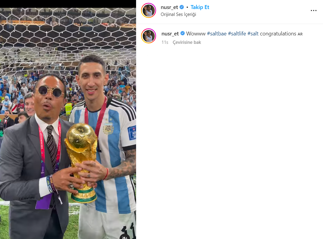 Arjantinli futbolcularla birlikte kutlamalara katılan Nusret, ünlü tuzlama hareketiyle sevincini paylaştı. Futbolcularla fotoğraf çektiren ve Dünya Kupası'nı tutan Nusret'in görüntüleri, sosyal medyada trend'ler arasında girmeyi başardı.