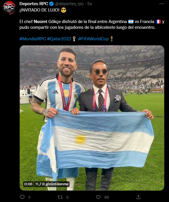 2022 Dünya Kupası finalinde Fransa'yı yenen Arjantin, kupaya uzanan taraf olurken maç sonunda ilginç bir görüntü dikkatlerden kaçmadı. Dev maçı stattan izleyen Nusret, karşılaşmanın bitiş düdüğüyle birlikte sahaya indi.
