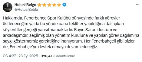 Belgü, sosyal medya üzerinden yaptığı açıklamada, Fenerbahçe Spor Kulübü’nde herhangi bir görev alacağına ilişkin çıkan haberlerin gerçeği yansıtmadığını belirtti. Açıklamasında şu ifadeler yer aldı: