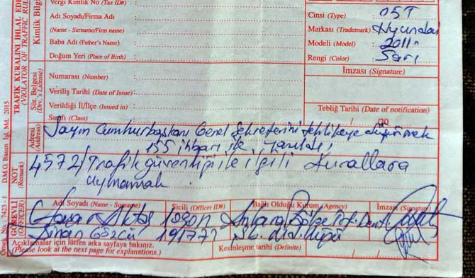Ankara’da 19 Eylül günü havaalanına yolcu götürürken, arkasına resmi araç konvoyu gelen taksi şoförü Mehmet Ali Yücedağ’a 20 gün sonra 88 liralık trafik cezası makbuzu geldi. 155’e yapılan ihbarla kesilen cezanın gerekçesiyse dikkat çekti. Makbuzda ceza gerekçesi olarak ''Sayın Cumhurbaşkanı Genel Sekreteri’ni tehlikeye düşürmek” yazılıydı.