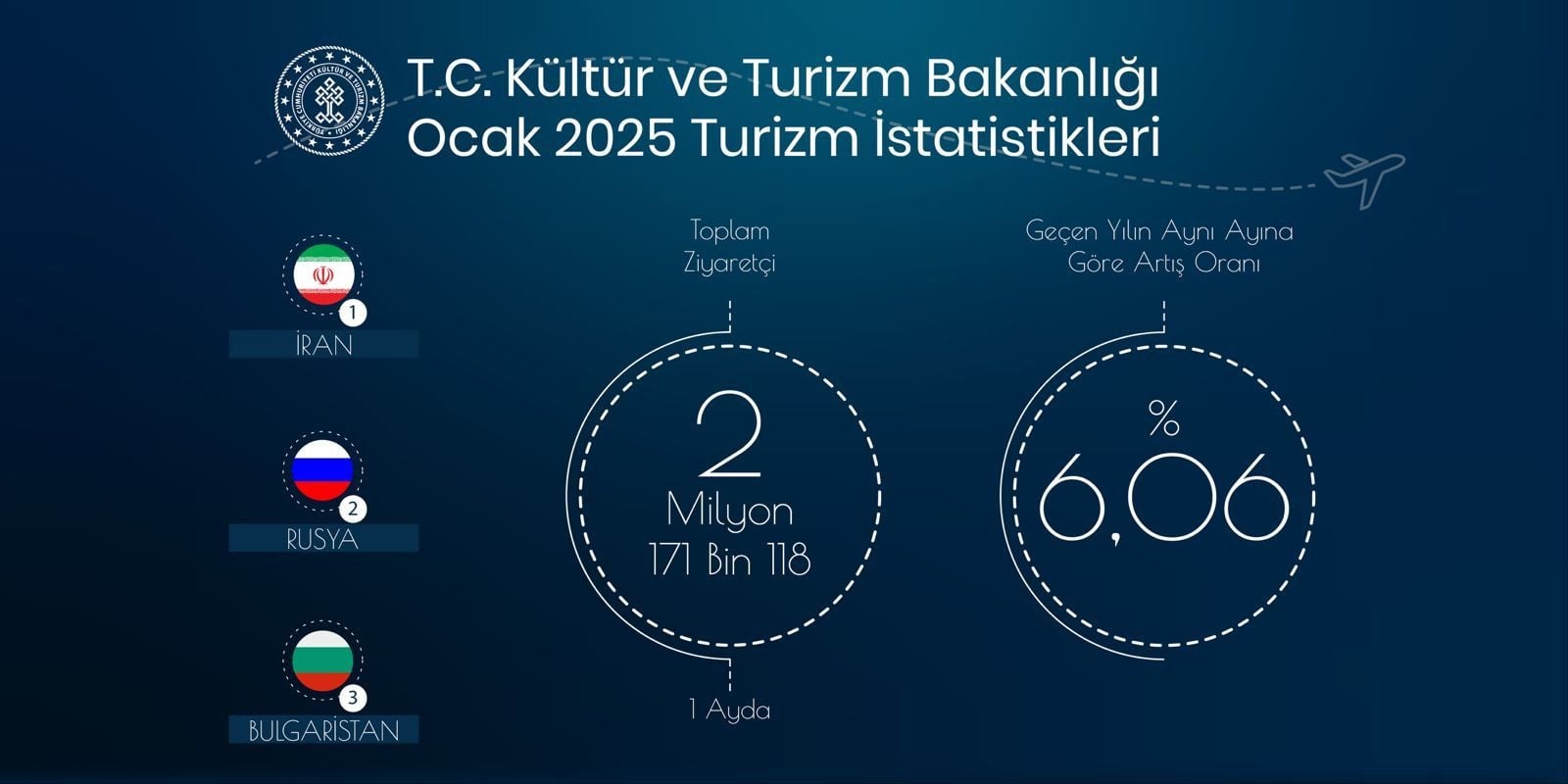 Ocak ayında 2.1 milyonun üzerinde yabancı turist Türkiye'yi ziyaret etti. Verilere ilişkin olarak Kültür ve Turizm Bakanı Mehmet Nuri Ersoy, "Türkiye, 2025 yılına turizmde güçlü bir başlangıç yaptı" açıklamasını yaptı.