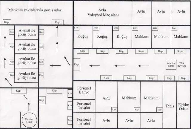 İmralı Yüksek Güvenlikli F Tipi Kapalı Cezaevi'ne gelen avukat ve mahkum yakınları ayrı kapıdan içeri alınıyor. Öcalan ve 5 mahkum avlu dahil 11.81 metrekare olan koğuşlarda tek başlarına kalıyor. Avluları ortak olan üç mahkum için yaptırılan ve Öcalan'ın kaldığı bölümün karşısındaki koğuşlar ise boş tutuluyor. Mahkumlar avukatları ve yakınları ile görüşmek için demir parmaklıkları olan kapıdan geçmek zorunda. Abdullah Öcalan kardeşi ve avukatlarıyla, diğer mahkumlar ise anneleri ve kardeşleriyle burada 45'er dakika açık görüşme yapıyor.