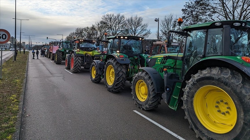 Traktörlerin üzerinde "Bizim sonumuz, sizin aç kalmanız demek", "Genç çiftçiler olarak bir geleceğe sahip olma hakkımız var mı?" yazılı afişler asan çiftçiler, Avrupa Birliği'nin (AB) tarım sektörüne yönelik destek ödemelerinin gecikmesini protesto etti.
