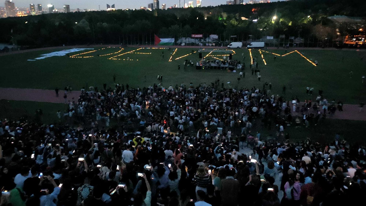 İsrail’in Filistin'e yönelik saldırılarını protesto eden ögrenciler “Katil İsrail, Filistin'den defol” ve “Filistin halkı yalnız değildir” sloganları attı. Devrim Stadyumu'na Filistin bayrağı asıldı.