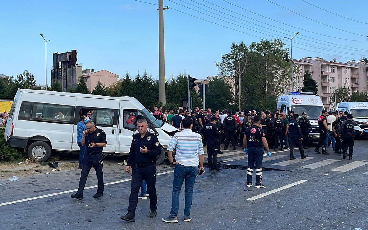 Servis aracındaki öğrencilerin yakınları, olay yerine gelerek kamyon sürücüsüne tepki gösterdi. Polis, kamyon sürücüsünü gözaltına aldı. (AA)