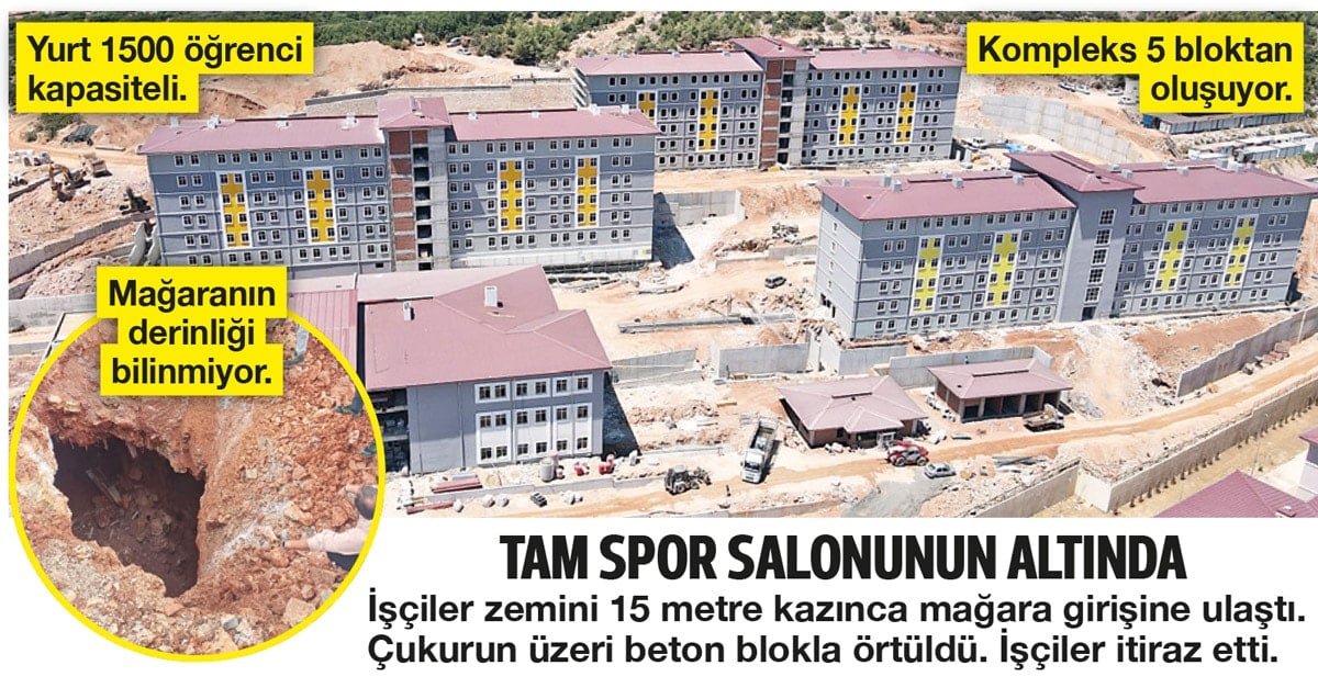 Muğla’nın merkez ilçesi Menteşe’de yaptırılan 5 bloklu kız yurdunun, içinde mezar bulunan mağara üzerine inşa edildiği ortaya çıktı. Yurt inşaatı sırasında vinç operatörü mağara girişini buldu ve ‘Burada mezar var’ diye video çekti. Ancak inşaatı yapan firma, mağara girişine beton dökerek kapattı. İnşaatta taşeronluk yapan Burhan Savtekin isimli iş insanı, Muğla Valisi, AKP milletvekilleri başta olmak üzere il müdürlerine video ve fotoğrafları göndererek, “Burası öğrencilere mezar olmasın” diye şikayetçi oldu. Ancak kimse ilgilenmedi.