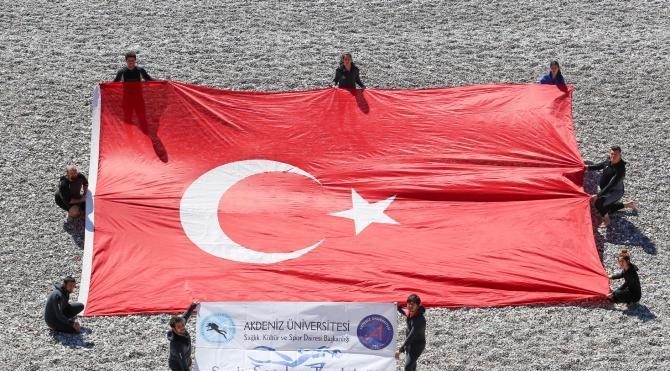 AKDENİZ Üniversitesi Sualtı Topluluğu (AKÜNSAK) öğrencileri, Çanakkale Deniz Zaferi'nin 102'nci yıldönümü nedeniyle denizde dev Türk bayrağı açtı.