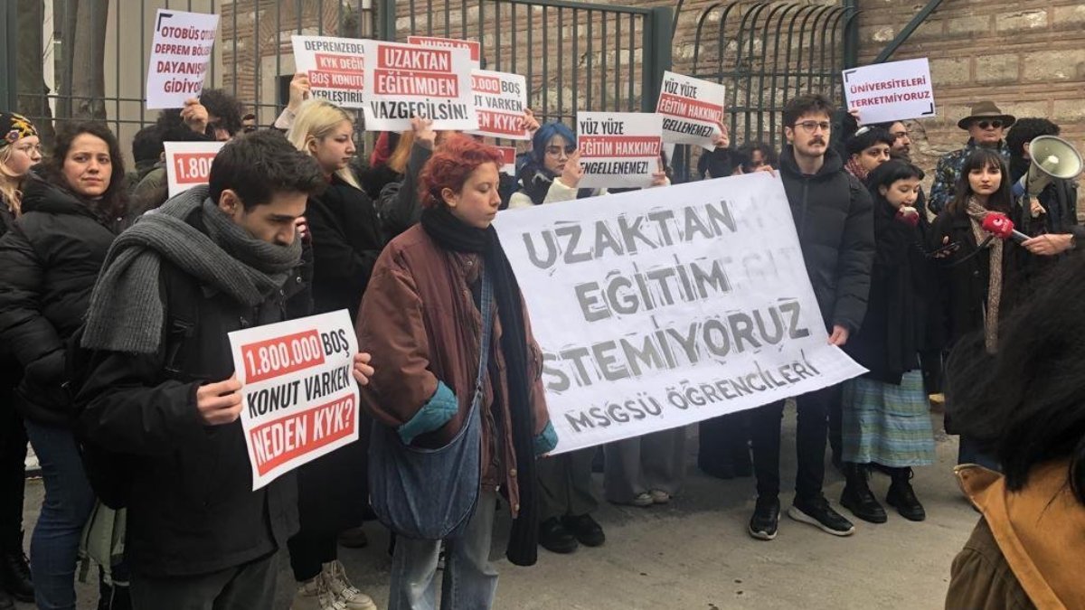 Mimar Sinan Güzel Sanatlar Üniversitesi öğrencileri Fındıklı Yerleşkesi'nde online eğitim kararına karşı basın açıklaması düzenledi. “Uzaktan eğitim istemiyoruz”, “1.800.000 boş konut varken neden KYK?”, “Yüz yüze eğitim hakkımız” yazılı döviz ve pankartların açıldığı basın açıklamasında, “Mimar Sinan Güzel Sanatlar Üniversitesi öğrencileri olarak bu süreçte vazgeçilen ilk alanın eğitim olmasını kabul etmiyoruz, bizler buradayız ve dayanışmamızı üniversitede yan yana gelerek göstermek istiyoruz” ifadelerine yer verildi.