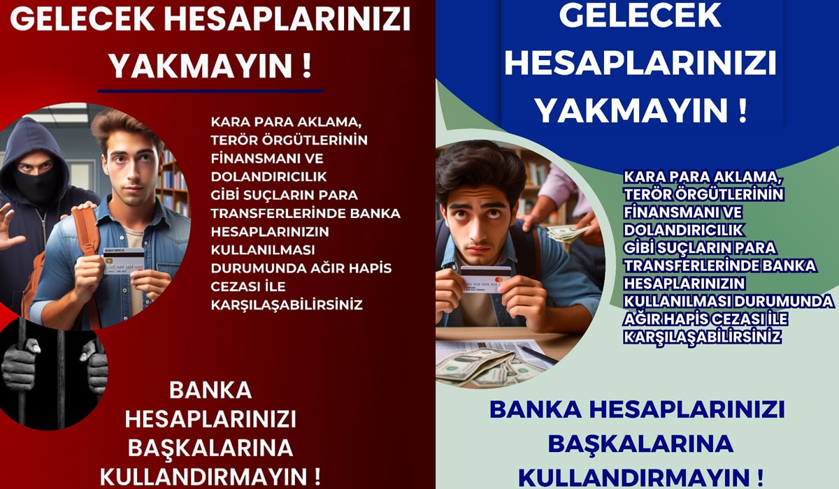 MASAK tarafından hazırlanan ve Yükseköğretim Kurulu tarafından üniversitelere gönderilen afişlerde öğrencilere “Gelecek hesaplarınızı yakmayın. Kara para aklama, terör örgütlerinin finansmanı ve dolandırıcılık gibi suçların para transferlerinde banka hesaplarınızın kullanılması durumunda ağır hapis cezası ile karşılaşabilirsiniz. Banka hesaplarınızı başkalarına kullandırmayın” uyarısı yapılıyor.