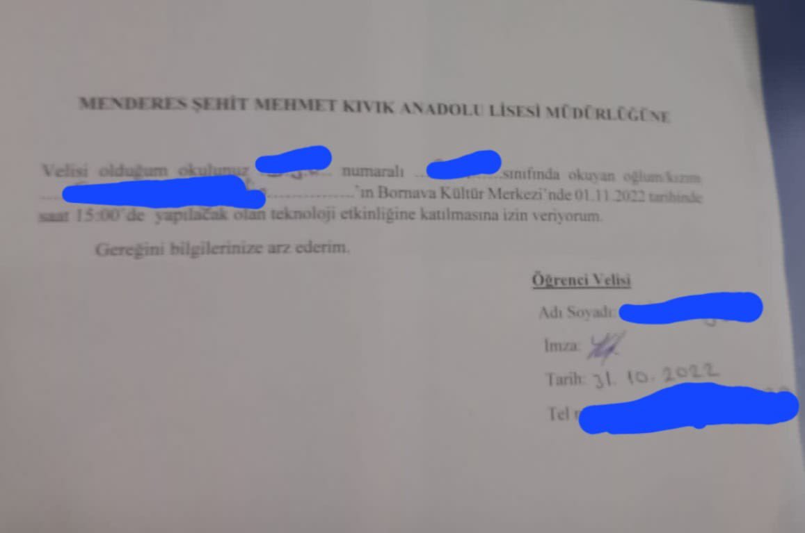 Öte yandan öğrencilerin velilerinden ‘teknoloji etkinliği’ diye izin alındığı ortaya çıktı. Öğrenci velilerine, “Velisi olduğumuz oğlumuz/kızımızın Bornova Kültür Merkezi’nde 01.11.2022 tarihinde saat 15.00’de yapılacak olan teknoloji etkinliğine katılmasına izin veriyorum” diye izin belgesi imzalattırıldığı görüldü.