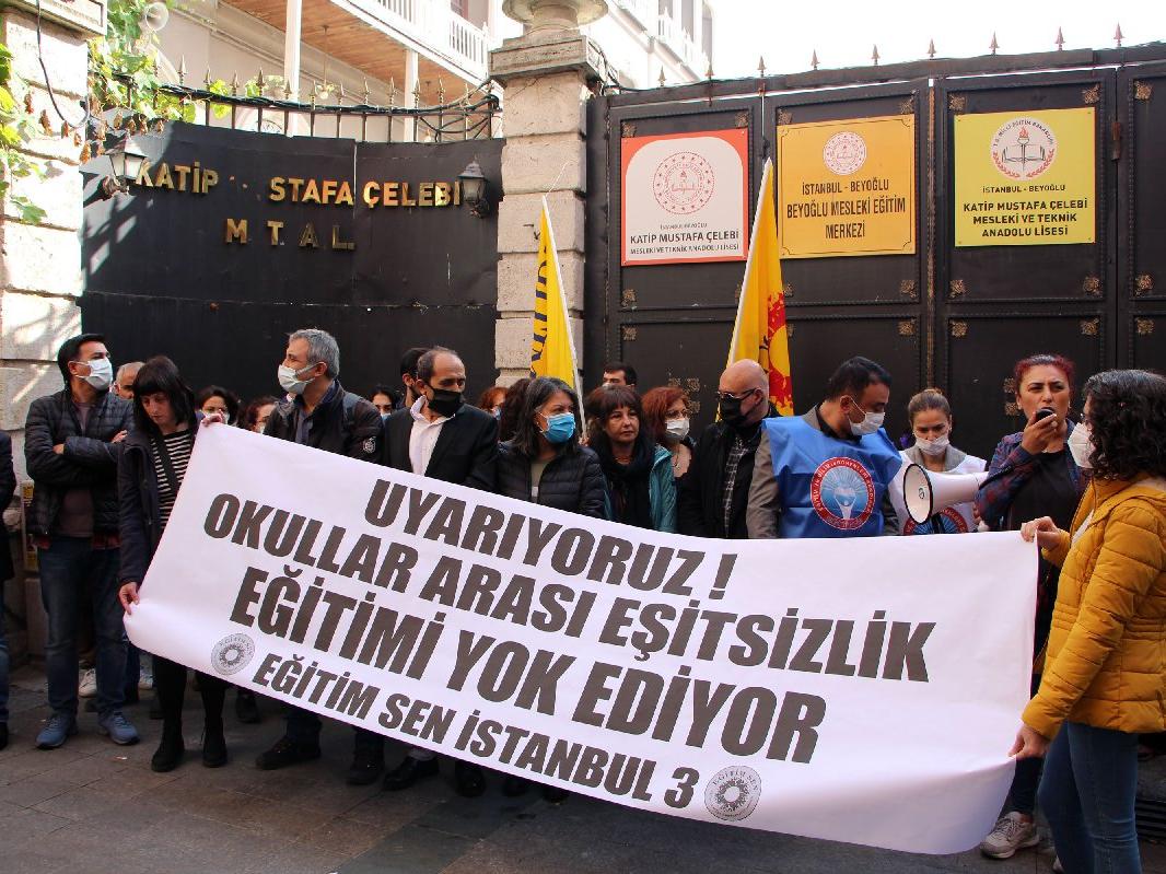 Okul önünde bir araya gelen sendika temsilcileri "Uyarıyoruz Okullar Arası Eşitsizlik Eğitimi Yok Ediyor" yazılı pankart açarak yaşanan şiddet olaylarının son bulmasını istedi.