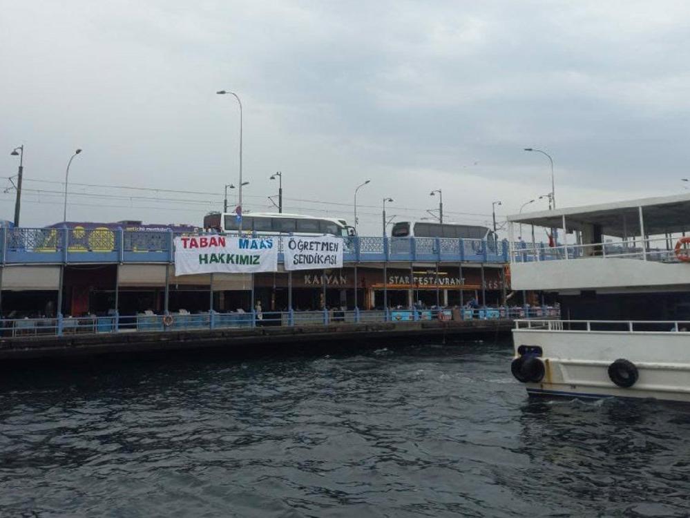 Özel Öğretmenler Sendikası’ndan yapılan açıklamada, "Öğretmenleri, tüm eğitim emekçilerini Galata Köprüsü'nden selamlıyoruz. "Taban Maaş Hakkımız/ Öğretmen Sendikası" imzalı pankartımızı köprüye astık. Israrlıyız. Talebimizin arkasındayız. Birleşerek Kazanacağız!" denildi.