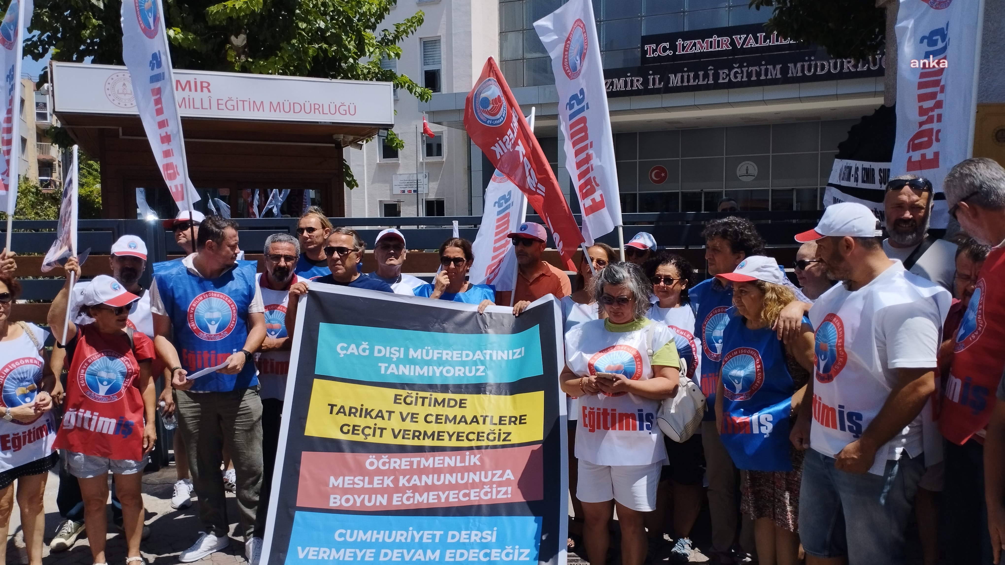 İzmir’deki İzmir İl Milli Eğitim Müdürlüğü önünde yapılan açıklamada, eğitimciler “Tarikatın bakanı Yusuf Tekin istifa”, “Dur de dur de ÖMK’ya dur de” ve “Meslek kanunu dediniz, ihanet ettiniz” sloganları atarak teklifin geri çekilmesi çağrısında bulundu.