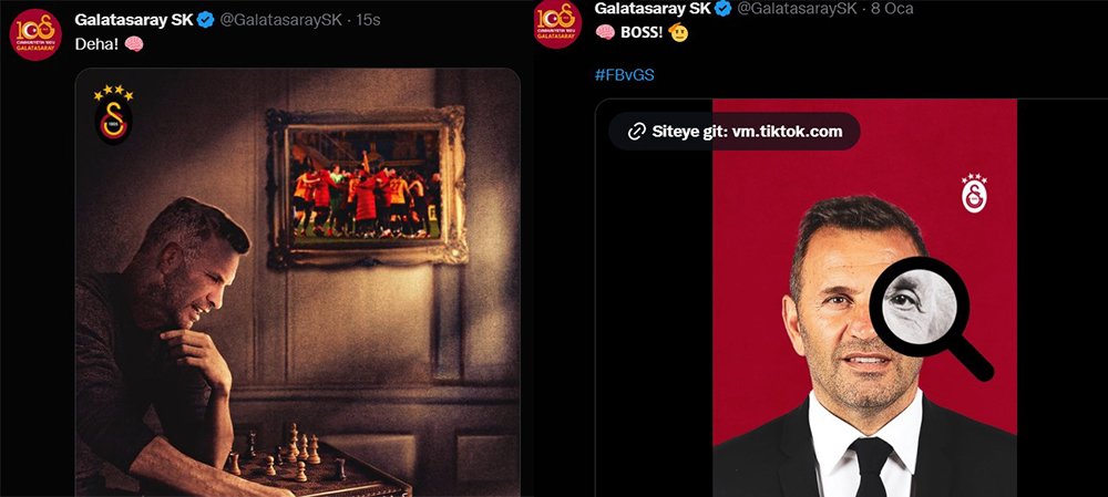 Galatasaray sosyal medya ekibi, Fenerbahçe zaferini pek çok görselle taraftarı için ölümsüz hale getirdi. Bunlardan birinde Okan Buruk, Albert Einstein ile özdeşleştirilirken diğerinde Cristiano Ronaldo ile Lionel Messi’nin satranç paylaşımına göndermede bulunuldu. Okan Buruk rakipsiz gösterildi.