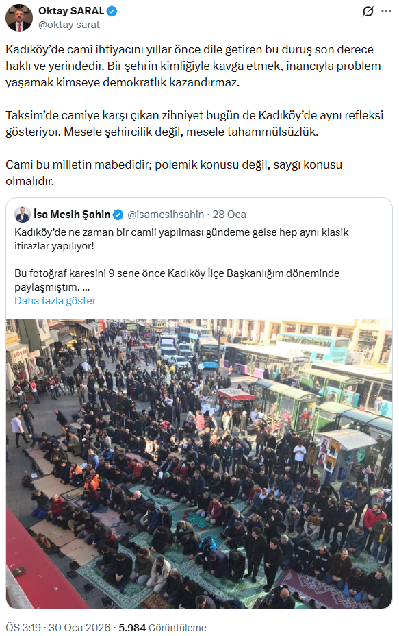 Söz konusu gönderiyi alıntılayan Cumhurbaşkanı Başdanışmanı Oktay Saral, "Kadıköy'de cami ihtiyacını yıllar önce dile getiren bu duruş son derece haklı ve yerindedir" dedi.