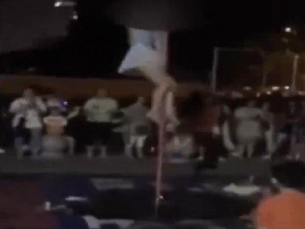 Okul önünde gerçekleştirilen direk dansı gösterisi akşam saatlerinde başlayıp, gece yarısına kadar sürdü. Okuldaki iki güvenlik görevlisi, dansçıları uzaklaştırmaya çalıştı.