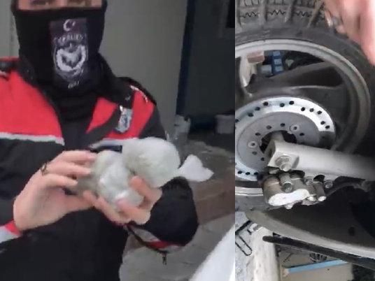 Motosikletten yoğun uyuşturucu kokusu gelmesi üzerine yunus polisi, inceleme yaptı. Yapılan aramalarda motosikletin ön tekerleğinin içerisine zulalanmış satışa hazır 3 parça halinde toplamda 67.25 gram gelen marihuana ele geçirdi. Ayrıca uyuşturucu madde ticaretinden elde edildiği düşünülen 765 liraya ve çiftin cep telefonlarına da el konuldu. Uyuşturucunun bulunduğu anlar ise kameralara yansıdı.
