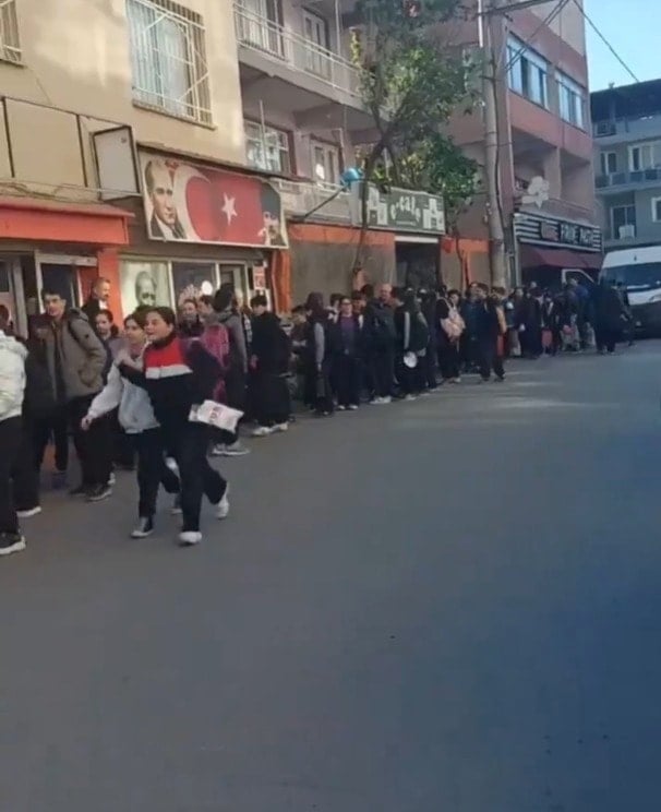 İzmir'de çekilen görüntülerde yüzlerce öğrenci, okula girişte yapılan güvenlik araması nedeniyle kuyruğa girdi. Söz konusu uygulamanın sürdürülemez olduğunu belirten veliler duruma tepki gösterirken, sosyal medya kullanıcıları ise öğrencilerin çok uzun süreler kuyrukta bekletilemeyeceğini söyleyerek öğrenci taraması uygulamasına tepki gösterdi.