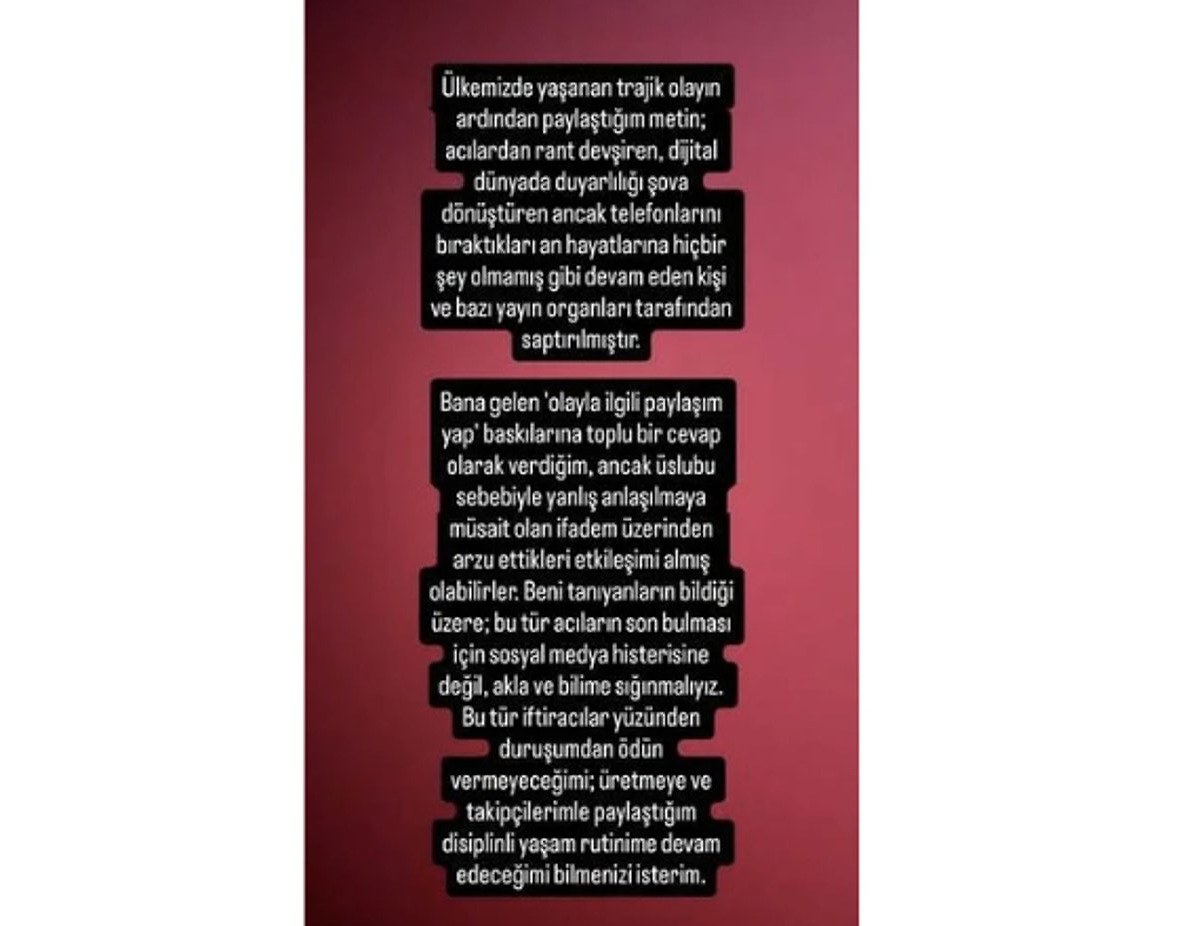 'Ülkemizde yaşanan trajik olayın ardından paylaştığım metin; acılardan rant devşiren, dijital dünyada duyarlılığı şova dönüştüren ancak telefonlarını bıraktıkları an hayatlarına hiçbir şey olmamış gibi devam eden kişi ve bazı yayın organları tarafından saptırılmıştır. Bana gelen, 'Olayla ilgili paylaşım yap' baskılarına toplu bir cevap olarak verdiğim, ancak üslubu sebebiyle yanlış anlaşılmaya müsait olan ifadem üzerinden arzu ettikleri etkileşimi almış olabilirler. Beni tanıyanların bildiği üzere; bu tür acıların son bulması için sosyal medya histerisine değil, akla ve bilime sığınmalıyız. Bu tür iftiracılar yüzünden duruşumdan ödün vermeyeceğimi, üretmeye ve takipçilerimle paylaştığım disiplinli yaşam rutinime devam edeceğimi bilmenizi isterim.'