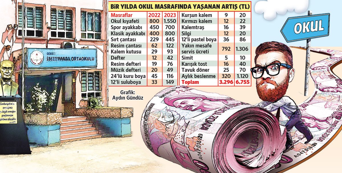 2023-2024 eğitim ve öğretim dönemi için geri sayım başladı. Öğrenciler okulların açılacağı zamanı beklerken, veliler de yeni bir zam dalgasına yakalandı. Okul kıyafeti, kırtasiye, yol, kantin gibi masraflar katlanarak arttı. CHP Aydın Milletvekili Evrim Karakoz, bir öğrencinin okul masraflarını geçen yıl ile kıyasladı. Bu kapsamda geçen yıl 3.296 TL’ye mal olan okul masraflarının, bu yıl yüzde 105’lik artış ile 6.755 TL’ye kadar yükseldiği ortaya çıktı. “Veliler, dudak uçuklatan masrafları düşünüyor” ifadelerini kullanan Karakoz, “Defter, kalem, çanta, ayakkabı, servis ve kantin masrafına kadar birçok ürün ve hizmette çok yüksek artışlar oldu. Veliler, kırtasiye, zincir marketler ya da toptancılarda hesaplı bir ürün bulamıyor. Etiketler sürekli değişiyor, ürünler zamlanıyor” dedi.