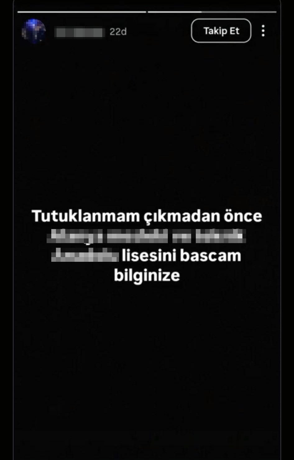 Yapılan incelemede, Z.B.A.'nın sanal medya hesabından okulu hedef alan paylaşım yaptığı tespit edildi.