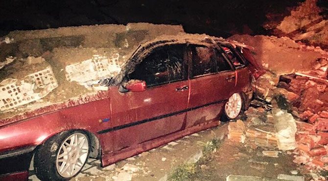 Okulun bahçe duvarı park halindeki iki otomobilin üzerine çöktü.