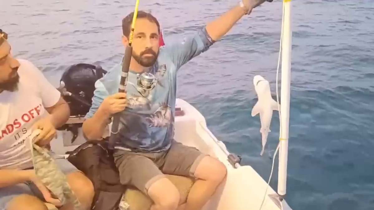 Uzun uğraşlarla balığı deniz yüzeyine çıkaran Özdemir ve arkadaşları, 60-70 santimetre boyundaki yavru köpek balığını görünce heyecanlandı. Küçük balık için yapılan takımlardaki 2 iğnenin ucuna takıldığı gözlenen köpek balığı, tekrar denize bırakıldı.