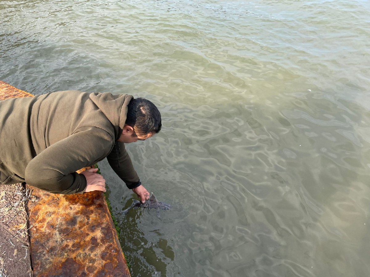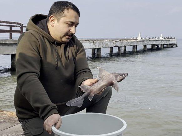 Avladığı balığın Türk denizlerinde nadir rastlanan domuz köpek balığı olduğunu öğrenen Ekinciel, balığı yeniden doğal yaşam alanına salmak üzere Yürüyen Köşk İskelesi'ne gitti.