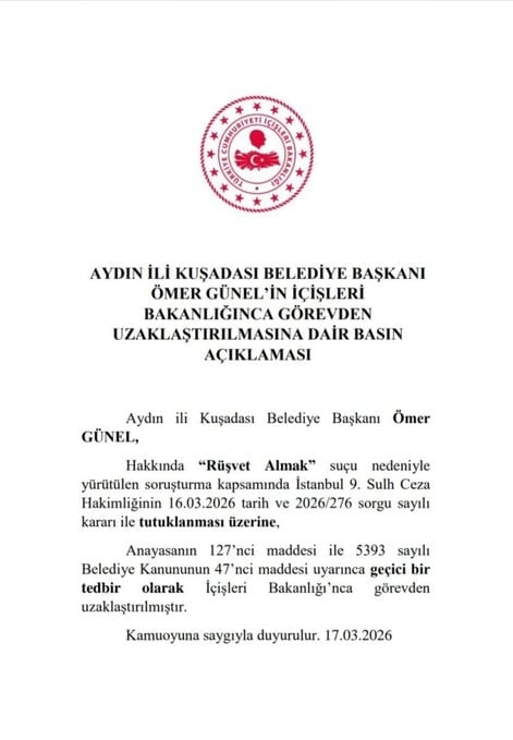Aydın'da Kuşadası Belediyesi'ne yönelik düzenlenen operasyonda tutuklanan Belediye Başkanı Ömer Günel, görevinden uzaklaştırıldı.