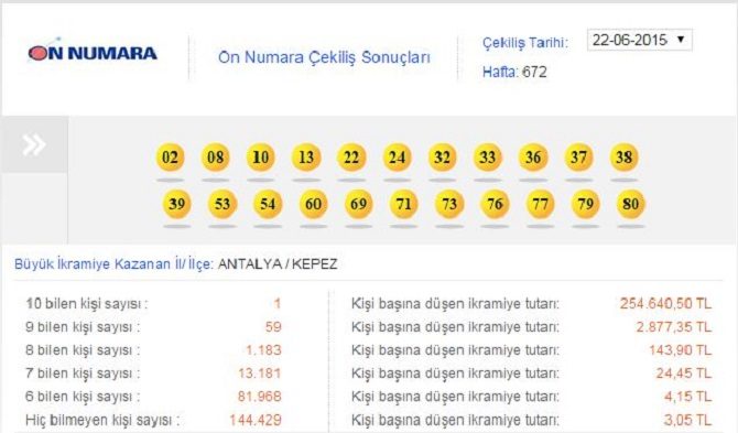 On Numara oyununun bu haftaki çekilişinde 10 bilen bir kişi 254 bin 640 lira 50 kuruş ikramiye kazandı.
