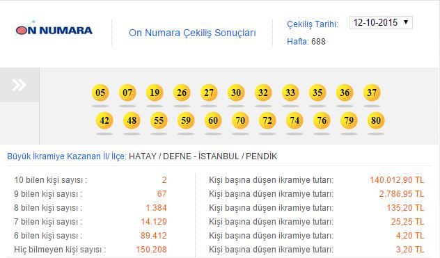 Milli Piyango İdaresi tarafından yapılan açıklamada 12 Ekim On Numara çekilişinde on bilen 2 kişi 140 bin 12 lira 90'ar kuruş ikramiye kazandılar. On Numaranın bu haftaki talihlileri Hatay - Defne ve İstanbul'un Pendik ilçelerinden çıktı.