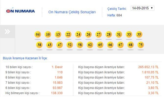 On Numara çekilişi dün akşam MPİ tarafından yapıldı ve sonuçları belli oldu. On Numara çekildi ve 14 Eylül Pazartesi On Numara çekilişi sonucu belli oldu. Milli Piyango İdaresi tarafından düzenlenen On Numara çekilişinde on bilen çıkmadı ve 265 bin 652 lira 23 kuruş hafta devir etti. İşte On Numara sonuçları ve bu haftanın sayıları...