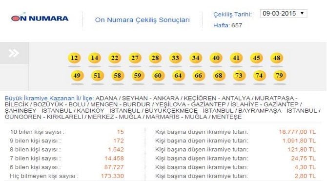 On Numara çekildi. Milli Piyango İdaresi tarafından düzenlenen On Numara 9 Mart çekilişi sonuçları haberimizde. On numara sonuçları haberimizden kontol edebilir, kuponunuzu sorgulayabilirsiniz. Milli Piyango İdaresi şans oyunlarından On Numara sonuçları çekilişten haberimizde. On Numara çekilişinde bir ilk yaşandı. On Numara 9 Mart çekilişinde on numarayı tam 15 kişi bilip kişi başı 18 bin 770 lira ikramiye kazandılar. On Numara 6 Mart sonuçları ile On Numara 657. haftanın sonuçları detayları ile haberimizde.